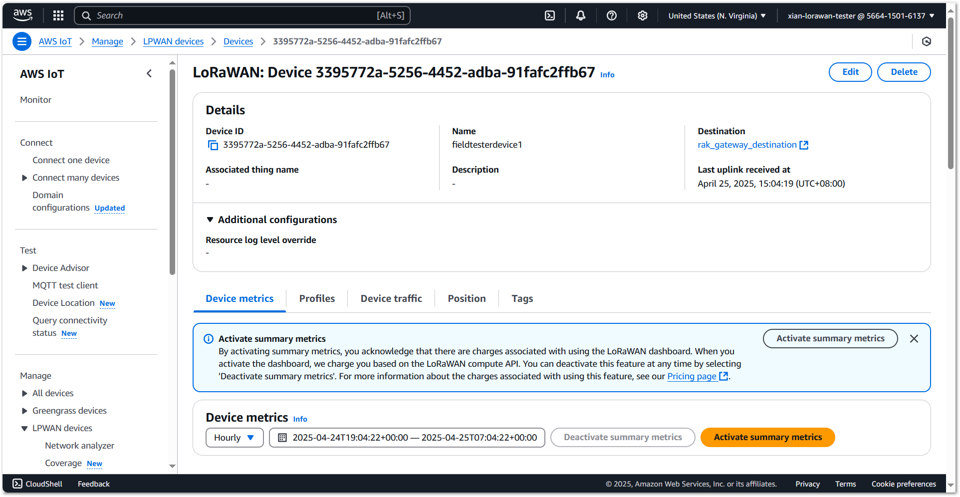 Once registered, the Field Tester Plus will begin sending periodic uplinks to the AWS IoT Core.